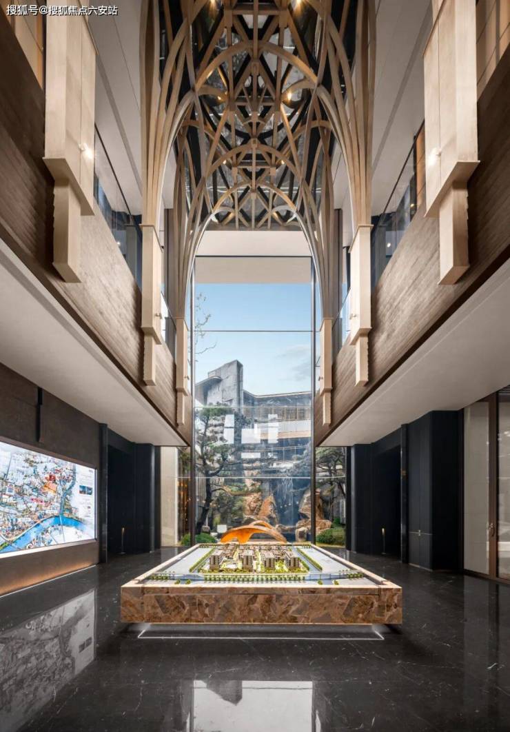步入大堂,头顶斗拱造型灵感源自六和塔,结构设计巧妙融合钱塘江潮涌、东方榫卯和江南园林拱门造型,还融入临平非遗“丝织蚕茧”的灵动模样,每一处褶皱、每一道光影折射,均经过 3D 建模预演,确保从负一层至首层的视觉连贯性。