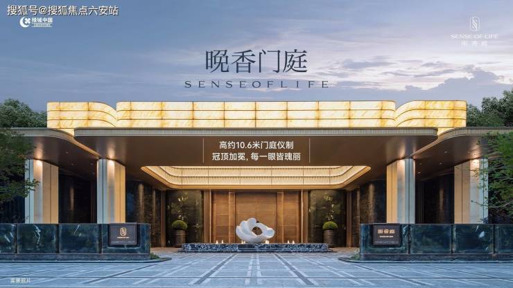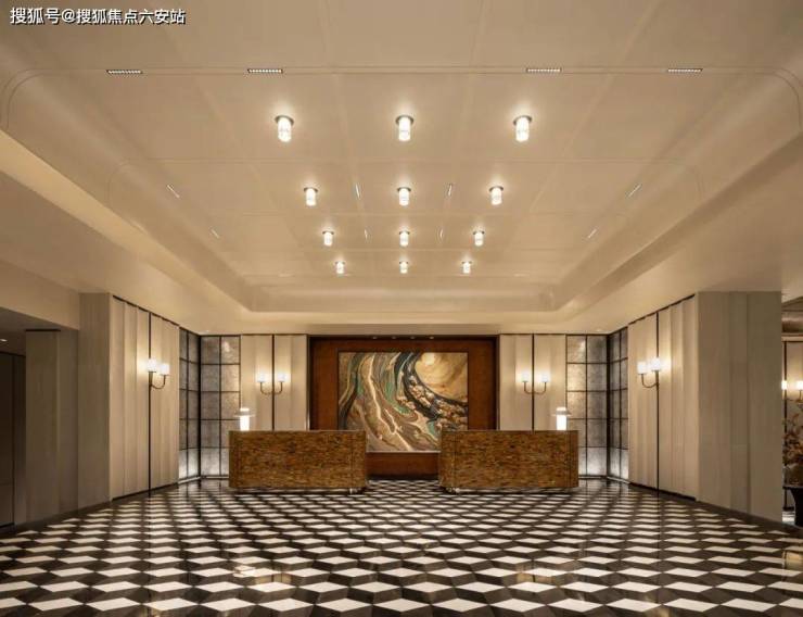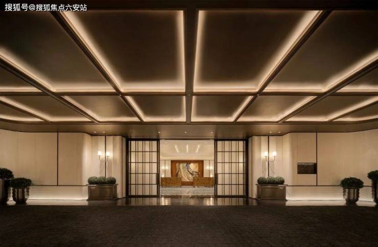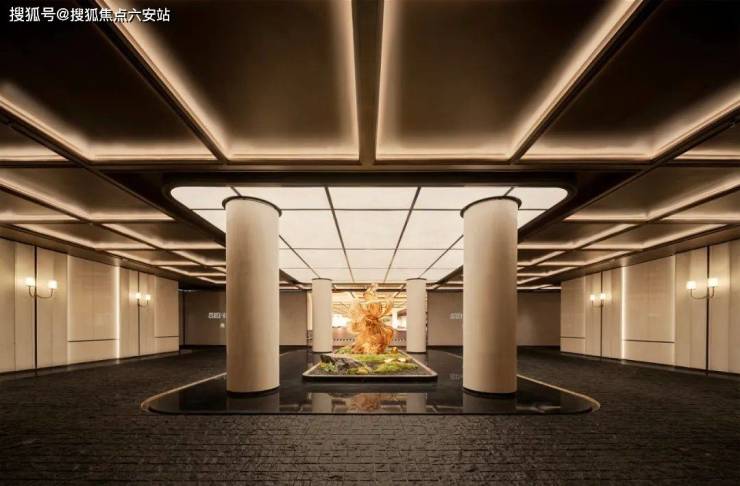 步入门庭,云石吊顶之下,借鉴中国古代建筑中的“藻井”做法,由522片皇家白玉石材拼接而成,凝聚光华,辉映时空。华光之下,中心水池承托起艺术雕塑,莹润皎洁,宛若珍宝。立面则采用铂金钻奢石,搭配墨绿荷塘月色奢石、安哥拉黑奢石花钵、以及手工锻造的巨幅铜门,流淌出一抹温润质感。