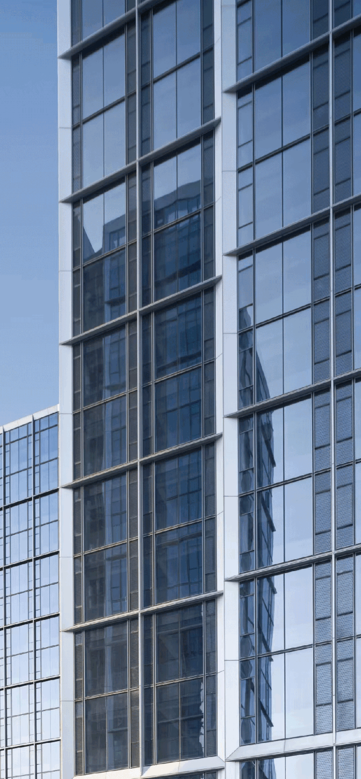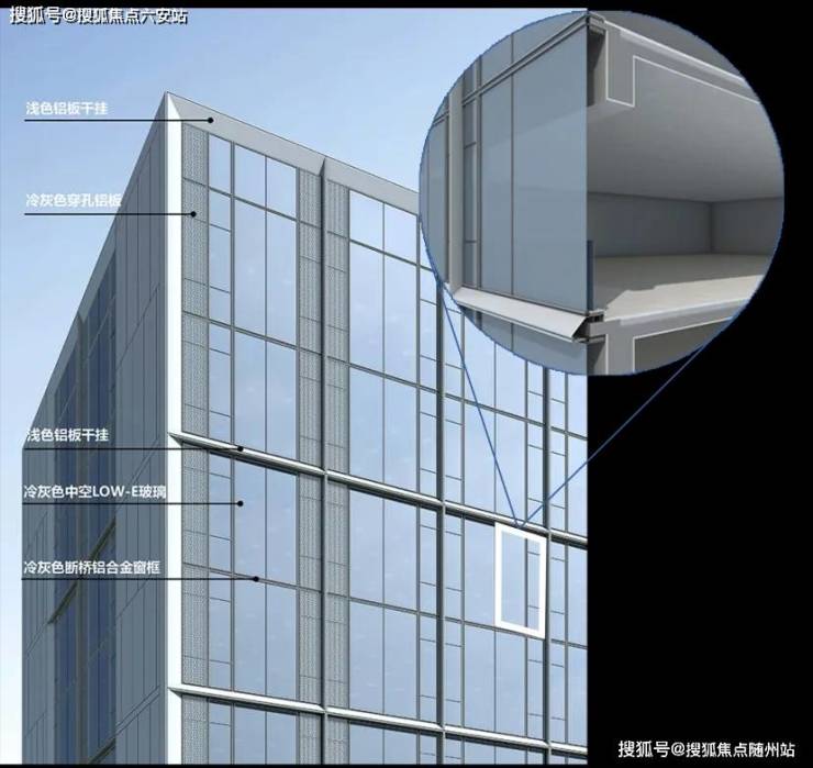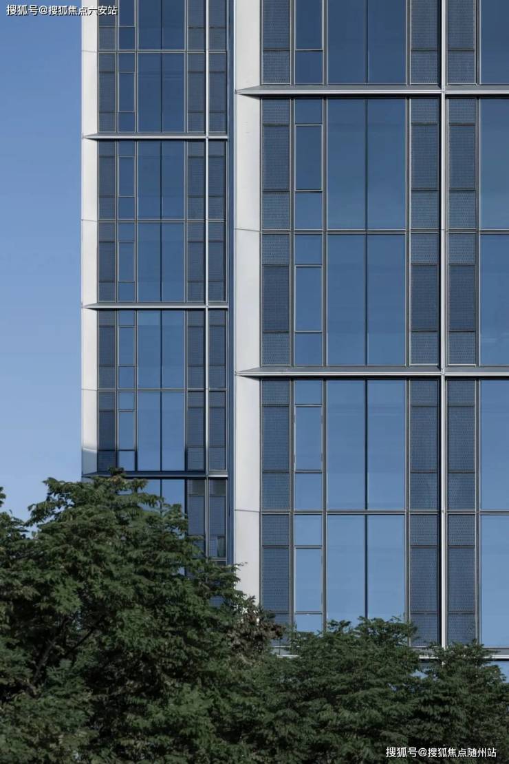 在住宅建筑周遭,精心规划的100米缓冲区内,面向家园的每一寸建筑肌肤皆被赋予了细腻考量——摒弃了冷硬的全玻璃幕墙,取而代之的是窗墙体系,其设计灵感源自于幕墙的美学精髓,却又巧妙地融入了温暖的人文关怀。外立面以大面积玻璃搭配斜切45°的银灰色金属铝板干挂和冷灰色穿孔铝板,远观如钻石切面般闪烁在阳光下,如银河倾泻而下。