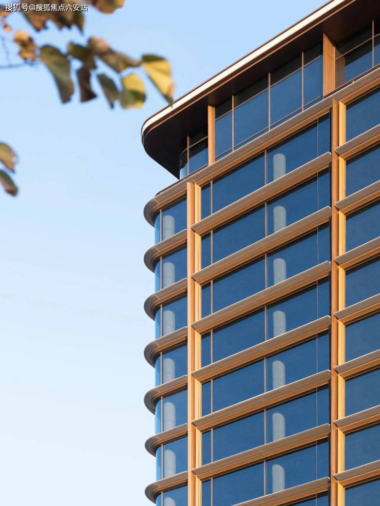 东部新城芯,大家维科明湖逸庐以极致产品力致敬城市峯层。浅灰玻璃幕墙搭配黄金铝板线条,约38%绿化率营造五境园林