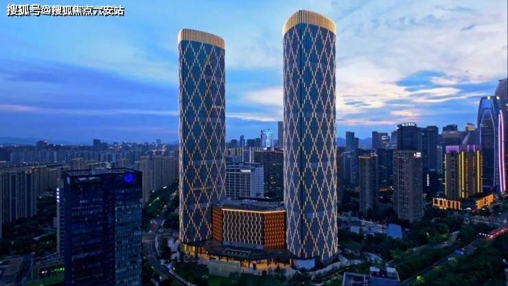 建筑设计:采用双子塔设计,外立面以松石绿玻璃和白色流线为主,夜晚灯光效果如钻石般璀璨,被誉为“小杭州之门”。