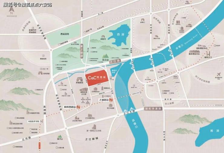 位置:位于杭州西湖区之江新城之浦路与之江路交汇处,宋城旁,九溪玫瑰园正南面,直面一线钱塘江景,背靠西湖群山