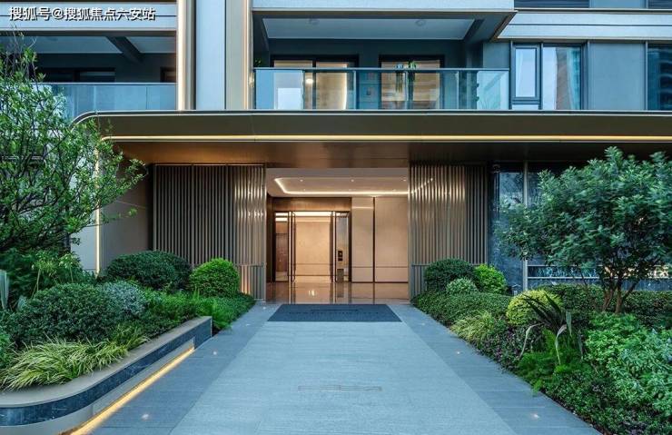 奢雅的酒店式社区大门搭配洄游式落客区,尊贵的归家仪式感拉满;就连楼栋入户门头都采用了铝板和石材,结合格栅点缀细节,质感满满。