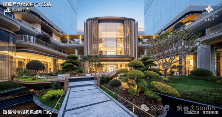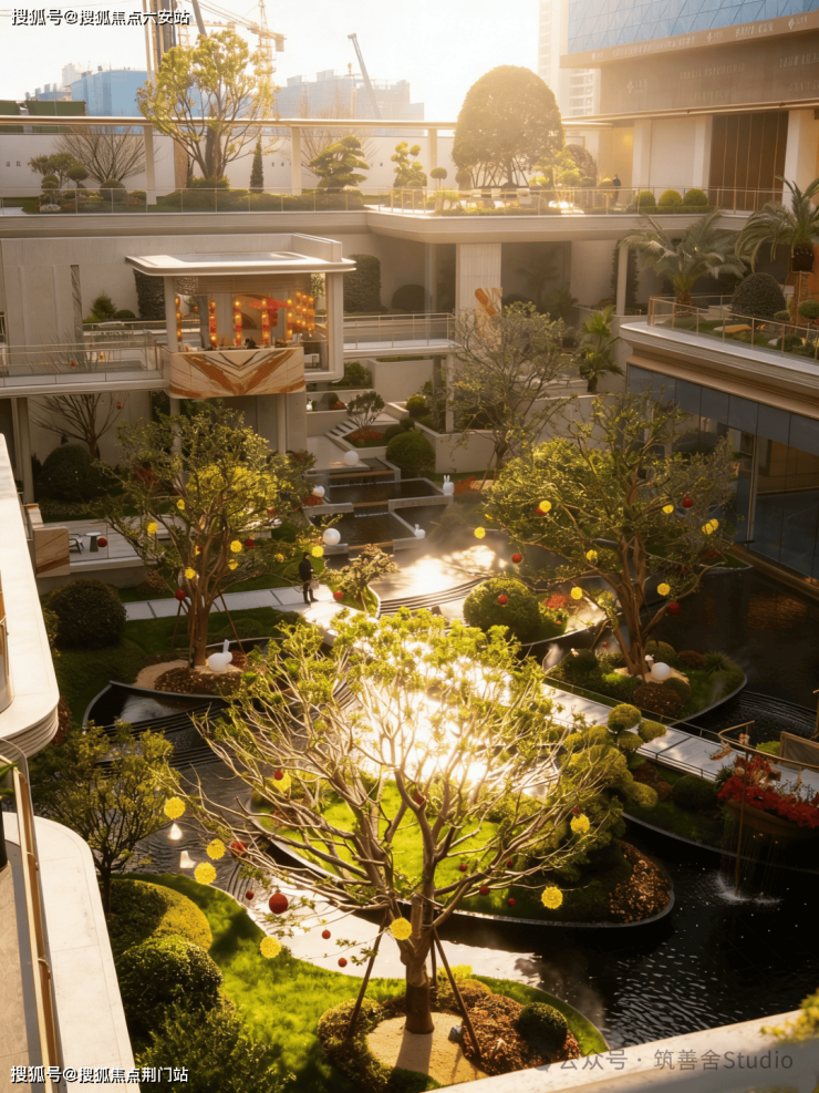 入口处精心打造的树阵水院,以静谧尊贵的氛围迎接归家。巧妙运用高差设计,通过层层递进的景观节点,优雅地引导业主步入社区深处。