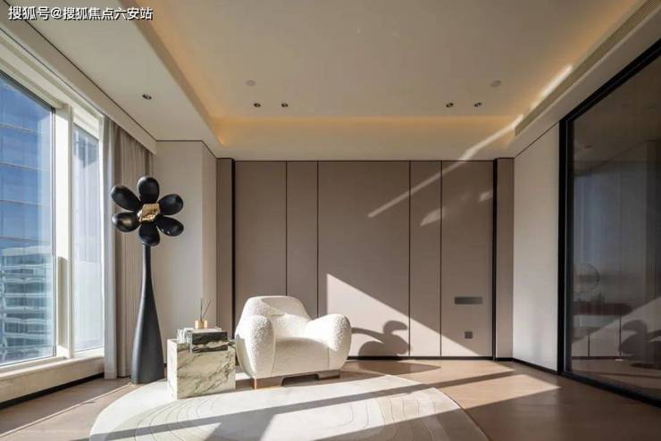 如同钱塘江的金色波光,温柔地流淌在室内,带来温润的质感,灵动的弧线在这里交织,它们以艺术的姿态,营造出一种柔和而宁静的境界。背景墙用雪山银狐奢石及弧面设计手法、对比落日的余晖,模糊了空间与外界的界限,落地窗给予空间最大限度的光线互相交融,打造风雅自在的生活情调。