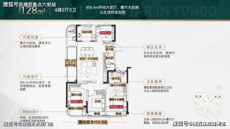 约6.4米开间大竖厅,约9.3 米南向观景面,