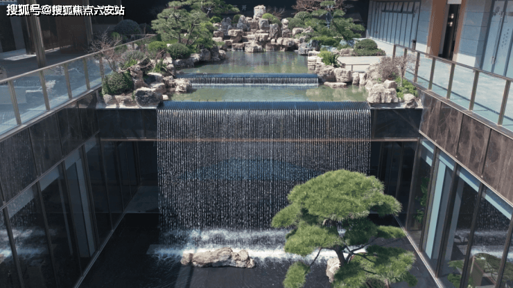 项目以“金镶玉”为立面灵感,原木色与大面积玻璃交相辉映,70米奢阔门头尽显从容气度。歇山顶、三重檐等传统元素经现代工艺重构,干挂石材与铝板立面历久弥新,低调奢雅的东方气质浑然天成。走近门庭,超70米尺度大门以宋画铺陈,山水造景与双株黑松映衬淡灰色花岗岩,入门前便生门庭凛冽之感,仿佛穿越时空,步入宋代文人的雅集画卷。