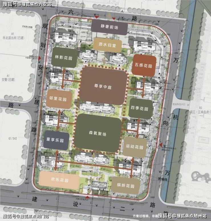 切换到小区主入口,以院落、水景、长廊形成了系统化场景串联,以泗水归堂为节点,把喧嚣城市代入静谧园区,形成酒店般的归家感受。