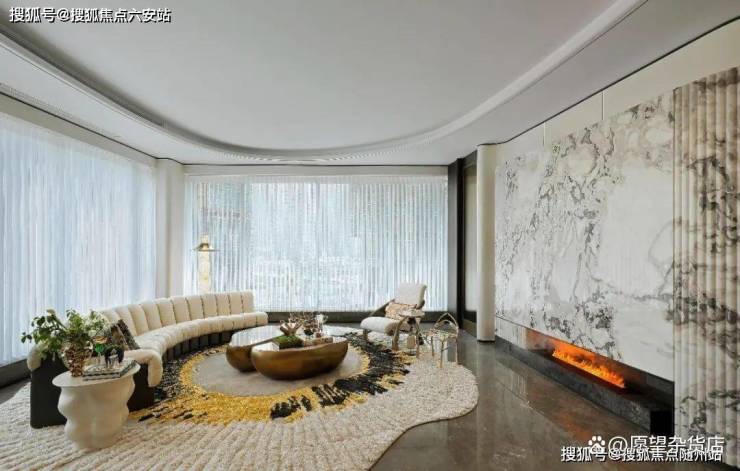 东区建面约320户型,将艺术感进一步融入日常中。特别设计的专属门厅空间,是从电梯厅延伸到家,如同一处艺廊,放慢人的情绪;室内选用了浅金色奢石(外界也称其为“芬迪白大理石”)作为主要的石材,曲面的木饰面也为浅色,整体给人以明亮感。