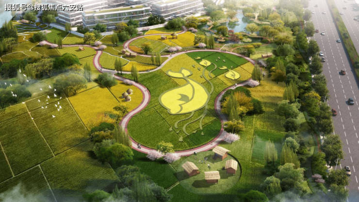 稻田当画布,秧苗为画笔,各种文字和图形都可呈现在其中。 园区内,组团景观穿插与广场于连廊之中,当目光透过玻璃幕墙,五常港河水潺潺流淌,漫步其中收获彩稻田四时变幻的田园风光,闭目凝想,微风、落叶、树荫、绿景……