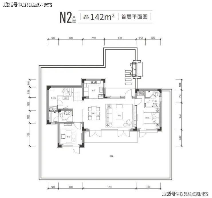 142㎡户型为例,面宽约15.2米,标准4房4卫。一楼是约7.2米长的双面采光大横厅,除了老人套房,还有个向院子伸出的“X空间”。