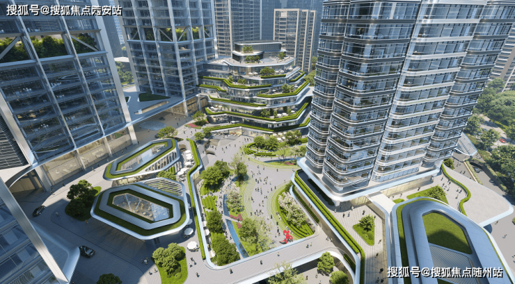 商务配套:对标伦敦市政厅广场的中心广场,含14000方立体景观(7座空中花园、屋顶跑道),办公间隙可享自然与艺术;