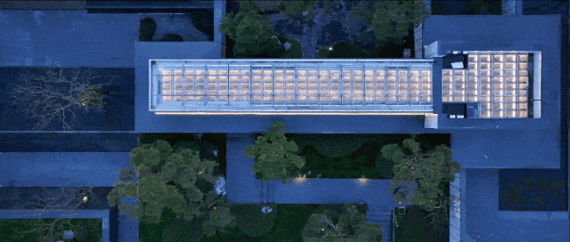 保利发展控股利用两侧高透光的落地超白玻,打造连廊空间,形成网帘式的透视感。以中式园林的引景手法,让建筑和自然融合在一起。在长廊顶部,以古代的装饰元素藻井为设计原型,视觉上很现代,也不失文化传承的底蕴。