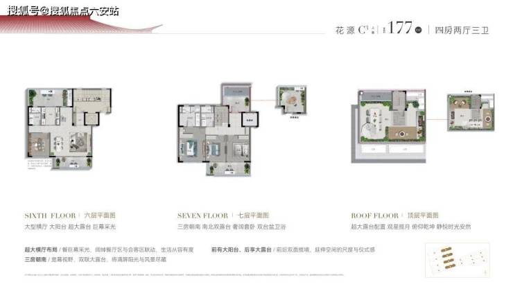 这里的所有户型均是餐客横厅,以南向巨幕空间,迎阳光与风光入室,盛载生活的格调。约9.7米面宽,营造三房朝南格局;约6.9米面宽,两房朝南;南向房间一字拉平,北向也设置房间,但确保每一层空间,与院落、阳台或露台衔接,迎接漫天漫地的阳光与月光。