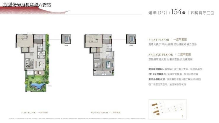 比如建面约170㎡的双层下叠四房两厅三卫,约9.7米面宽,三开间朝南的大四房格局。首层餐厅、客厅、品茶厅三个空间横向舒展,有机组合、互不干扰,单层就撑起了大平层的排场;窗外,还自带一个约9.7米宽的超大花园,满足各种野趣需求;二层是3个房间朝南,奢配约5.6米大阳台,两房联动,舒适自然。