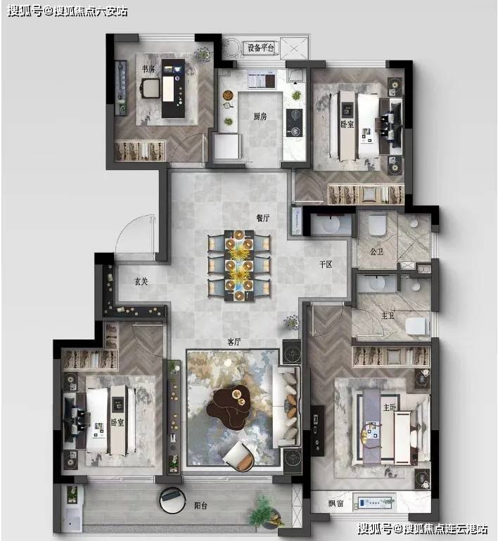 采用大面宽、短进深设计,打造奢阔横厅,采光通风俱佳。全面屋设计实现动静分离,居住舒适度高。