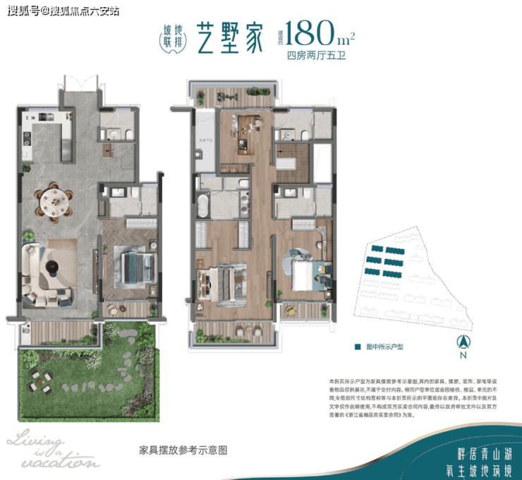 坡地联排:建面约160-180㎡,地上双层结构,单层落地面积达80-90㎡,全套房配置带独立卫浴露台。地下室层高5.8米,可改造为收藏馆或家庭沙龙,瑞士温根度假小屋灵感设计实现“移步赏景”的私密体验。