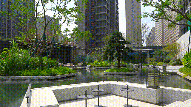 在景观打造上,同样可圈可点:项目园林以“一廊三心九园”的规划理念出发,构筑前文说到的风雨连廊、三大主题架空层、九大口袋花园等,以园区中央超5000方的“社交会客厅”为例,涵盖了草坪、茶亭、水景花园等不同功能模块,并连通三大架空层,这样做的好处在于能同时间创造出更多的生活场景。