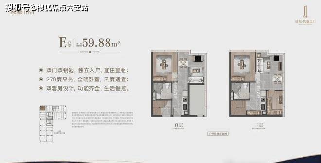 建筑面积约34-59㎡双钥匙公馆,买一层享两层,双倍空间,灵活多变,满足居住、办公、投资等多重需求,是杭州难寻的60万以下小户资产,且为实景准现房,小投入回报快,明星产品价值显著。