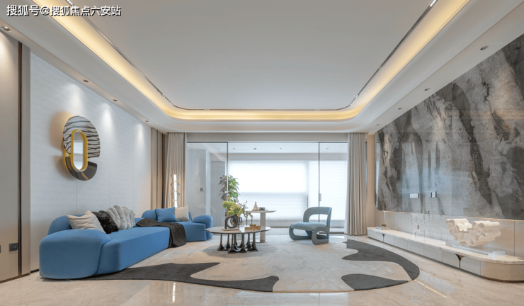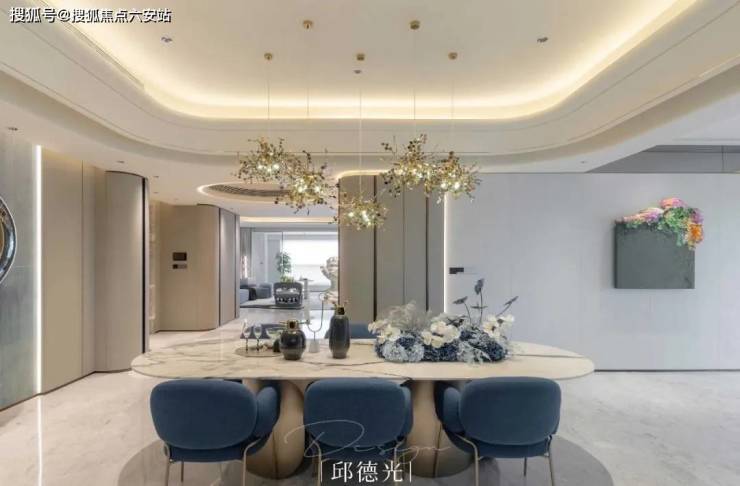 地面竟然是用鱼肚灰和东方鱼肚白做的圆弧形拼花,像层层翻涌的云朵梦想。雪山蓝的岛台(311㎡样板间),墨色的晶体泛着珍珠般的光泽,像一幅雪景中繁花盛开的水墨,圣洁中带着优雅。还有芬迪白、南斯拉夫白、直纹白玉、卡里冰玉等众多进口奢石,仿佛走入了世界顶级的石材陈列展示馆,品质感、价值感不言而喻。