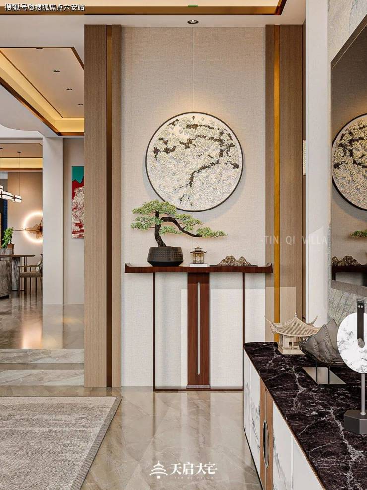 壁画造景,禅意山水诗画,中式盆栽造景,精致感与格调感兼得。打造治愈式玄关
