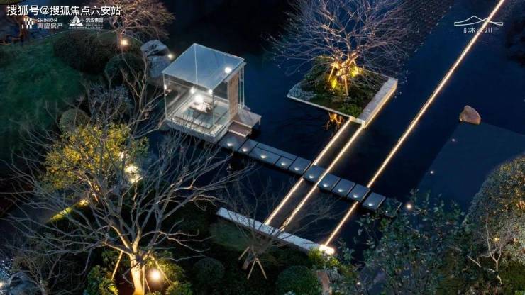 即便是夜晚,沐云川也有一套「夜行者美学」。项目在公区专门定制了一套精密的灯光系统,不仅照亮业主的归家之路,也编织出流光溢彩园区盛境,甚至美过白天。