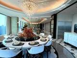 创新空间设计。项目最引人注目的设计亮点是约18米IMAX巨幕面宽,采用270°三面瞰景设计,揽尽城市天际线与九曲河风光。约10米阔尺横厅连接中西双厨,弧形岛台设计提升30%空间通透感,可承办私人宴会或家族聚会,满足塔尖人群的社交需求。