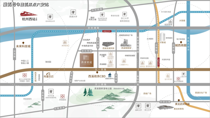 项目坐落于杭州城西蒋村板块,东接文教区氤氲书卷气,西临未来科技城创新浪潮,距阿里巴巴总部仅约3公里黄金距离。清晨,业主可漫步于五常港河畔,聆听潺潺水声与早鸟啼鸣;傍晚,信步800米即可踏入西溪湿地11平方公里的生态秘境。这种"出则繁华入则静"的极致平衡,恰是当代精英阶层对理想栖居的终极想象。