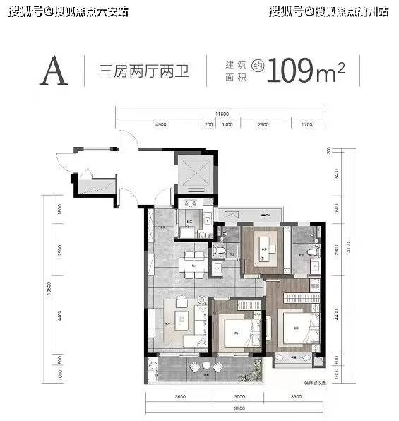 · 109㎡高层户型:三室两厅两卫设计,南向双阳台,主卧配备独立卫浴与衣帽间,空间通透实用;