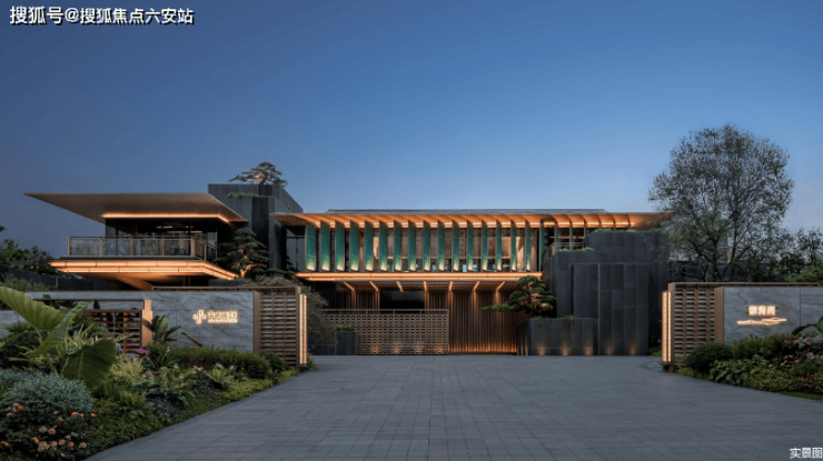 在立面打造上,提取宋代歇山顶样式,转译形成深远的挑檐,整体呈现一种清雅内敛的当代气质;大尺度巨幕玻璃窗镶嵌金色铝线条,极简化打造光影天幕,倒映自然之境;臻选靛蓝色的陶瓦,原创蓝金坡屋顶,掀起杭州合院立面的新序章。