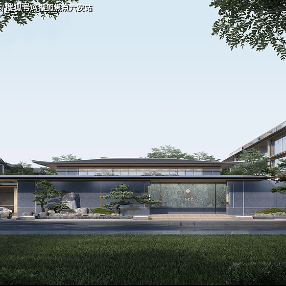 • 香槟金铝板+蓝眼睛石材干挂,融合歇山重檐、瘦金披檐等宋式元素;