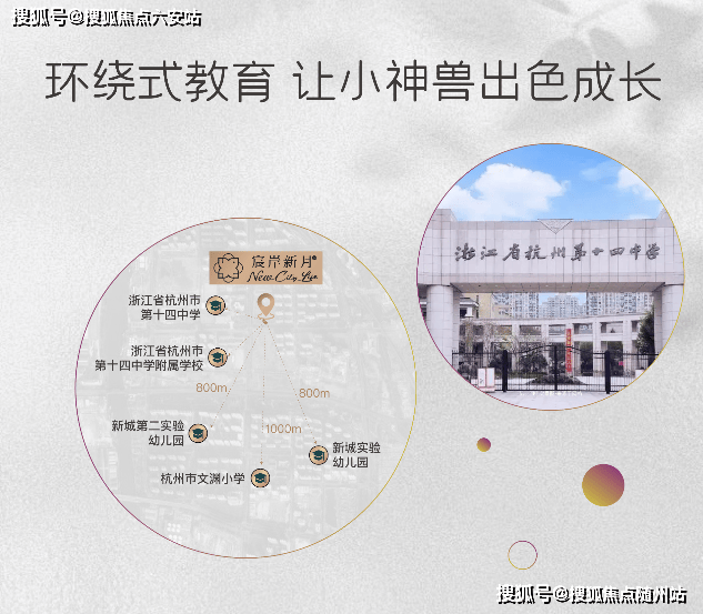 1公里环绕式学校:杭州第十四中(康桥校区)一路之隔。项目斜对面即杭州第十四中学附属学校(九年一贯制)。新城实验第二幼儿园、杭州市文渊小学(新城校区)、新城实验幼儿园,均在直线距离约1公里范围内,主城区完整式教育链无需“二次迁徙”。(以上内容仅供参考,不作为学区承诺,具体教育信息以政府教育部门政策为准)