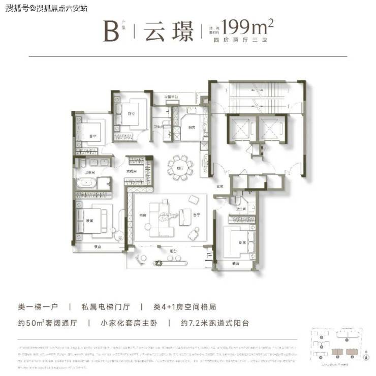 宸云建面约199㎡的户型,约14.85米的超大面宽,约50㎡的奢阔通厅,约7.2米面宽大超大阳台,双主卧套房设计,实现一步到位的终极改善,三代同堂的怡然之乐。
