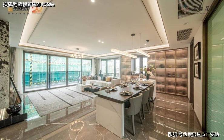 客厅北侧,衔接的是面宽约6米的餐厅,餐客厅约7.1米的进深,足够配一方西厨岛台或是吧台,许多300㎡大平层公区的尺度,也不过如此。