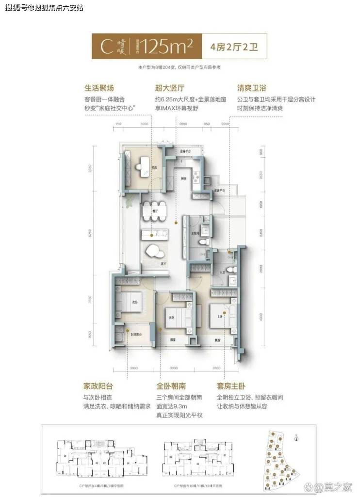 春来晴翠规划建面约104-169㎡全龄改善户型,105㎡南向采光超10米,109㎡、139㎡和169㎡三个户型都设计成四开间朝南,南向开间甚至达到了17米。