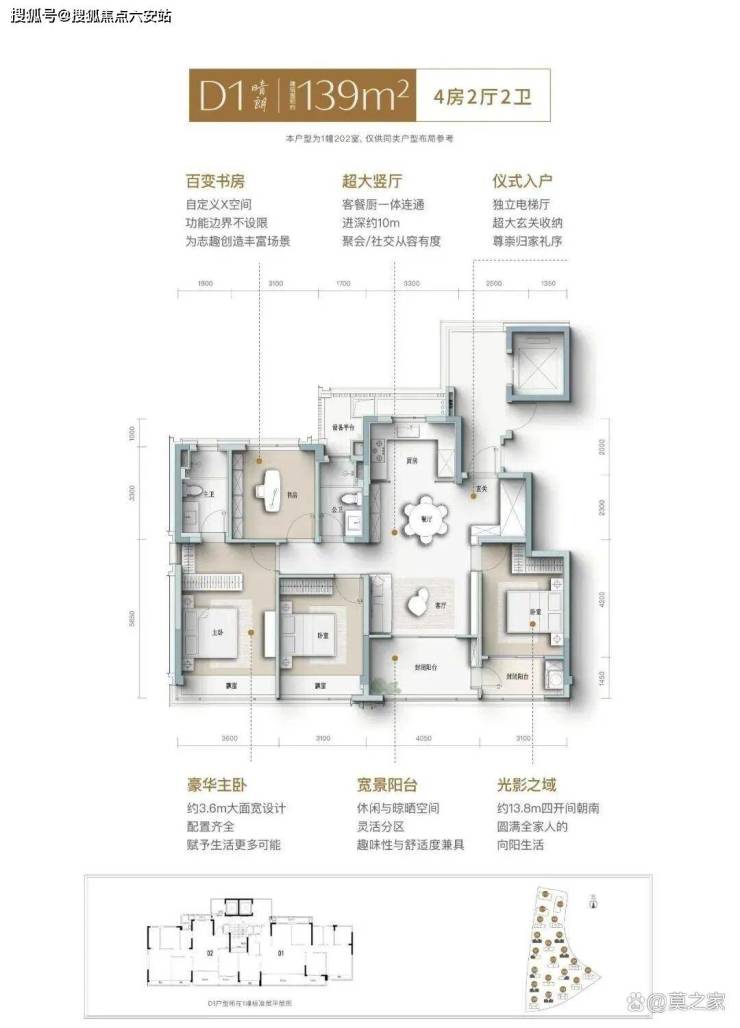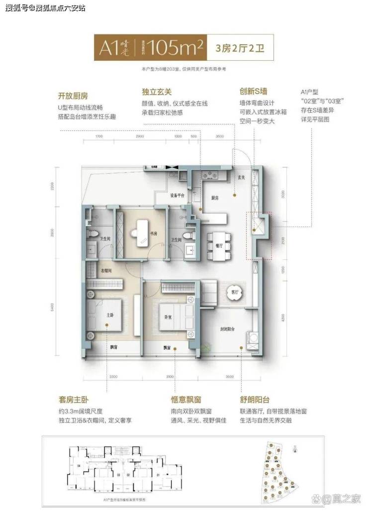 建面约105㎡晴光户型,不仅实现更优面积排布,更做到精神与审美的高度适配。在设计中,这间三房同样拥有南向大面宽,搭配S墙/开放式厨房/一体化餐客厅/多功能书房/酒店套房主卧等,将整个空间的开阔感和互动性做到极致,满足居住者对舒适、安逸的“精准需求”。