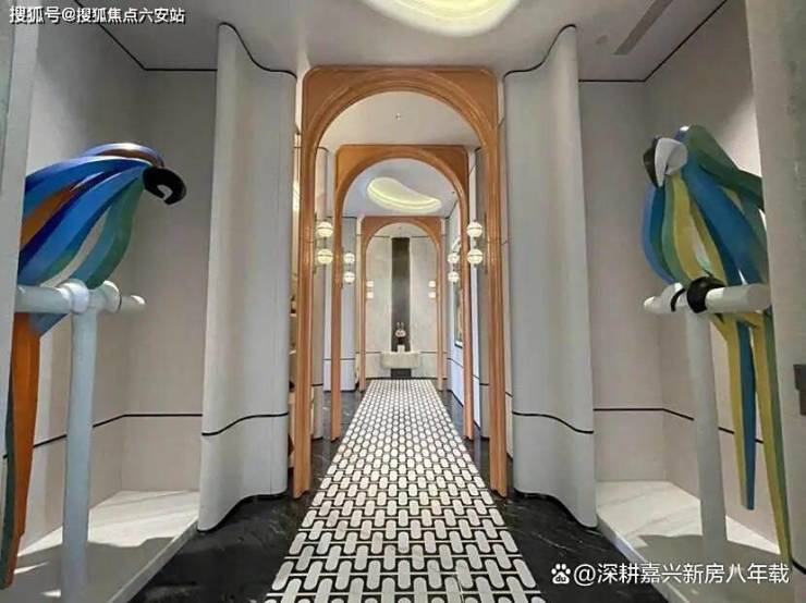 架空层空间也很丰富。7号楼架空层不仅有艺术走廊,还有独立书吧、休闲区等,往外看去就是绿植和蓝色景观水池。