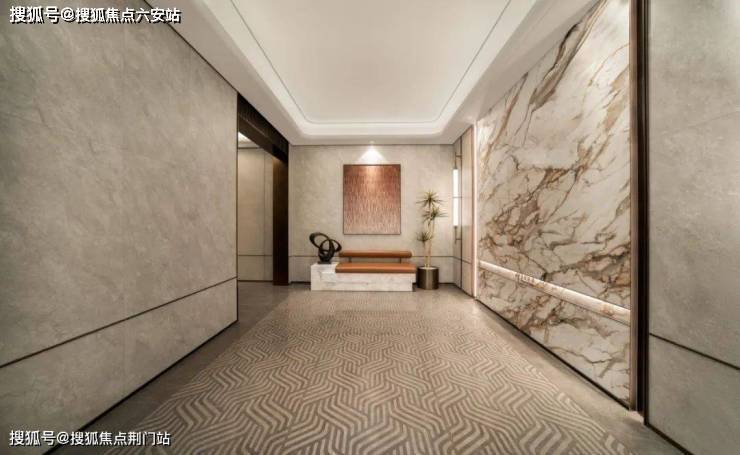 比如它的单元大堂,地面不是简单通铺,而是用上了定制波浪纹地砖,再用弧形金属波打线收边,质感特别高级。