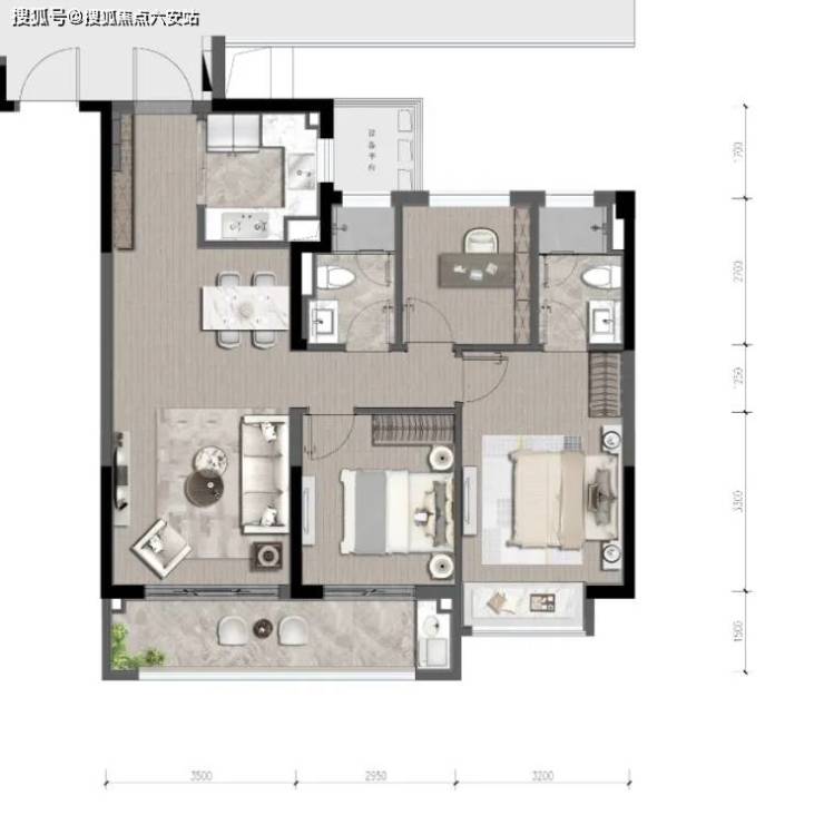 以明星款约106㎡户型举例,就是一套高配婚房,三房两卫布局,主卧还做了套房设计。