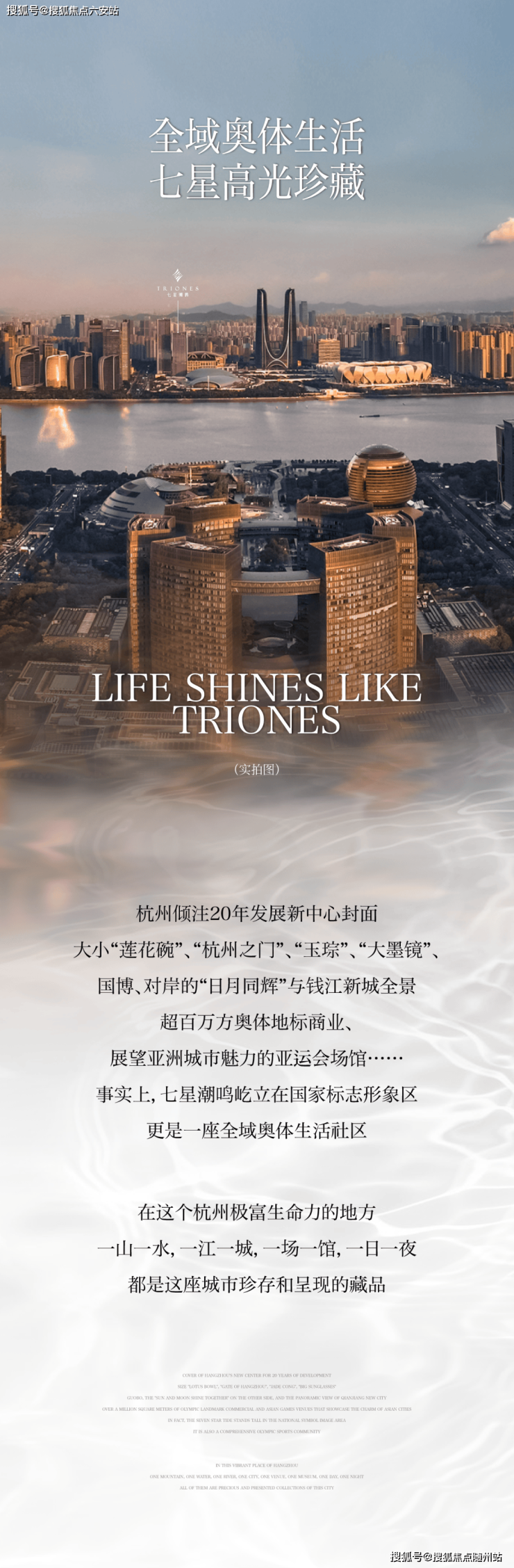 当你走进七星潮鸣,映入眼帘的是宽阔的钱塘江像山河社稷图般徐徐展开,日月同辉、大小莲花、游泳馆,目光所及的每一寸土地,都是地标。奥体,是繁华最深处,白天“千亿地标收集器”商贾云集,夜晚一江两岸霓虹璀璨川流不息。站在宇宙的中心,七星执首奥体七星,地位和身份的象征,你在俯瞰城市,城市也在仰望你。