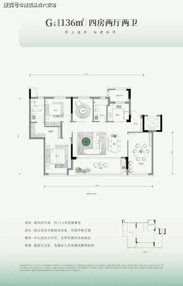 建面约146㎡做到了5开间朝南,大面宽短进深,南向阳台+飘窗面宽达约16.6m,可以做到双厅三房朝南,叠加浴缸、双台盆、休憩区等套房式主卧,这可是200㎡大平层才能达到的尺度。