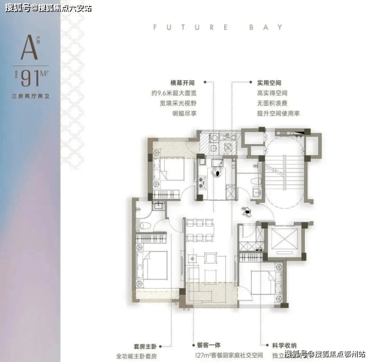 91㎡起步三房做到三开间朝南,约9.6米超大面宽搭配27㎡餐客厨一体化空间,最小卧室也有约9.5㎡。居然还带一个储藏间!小户型也不显逼仄。