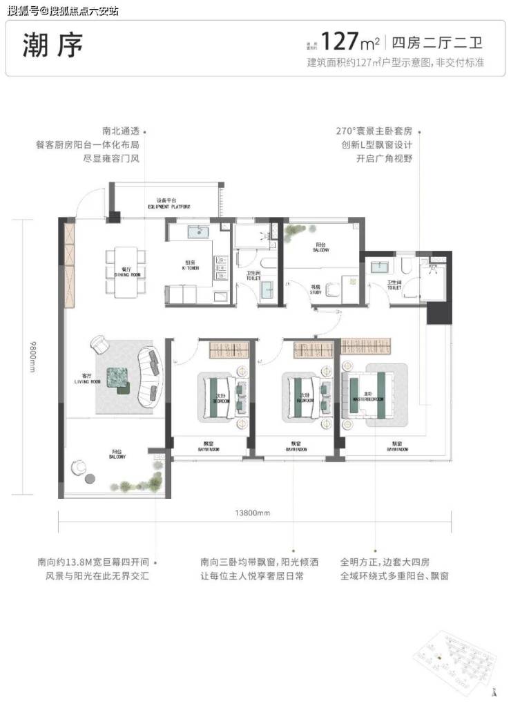 揽景小高层建筑面积约105-130㎡,为最大化景观面,突破性设计建筑面积约105㎡南向四开间。