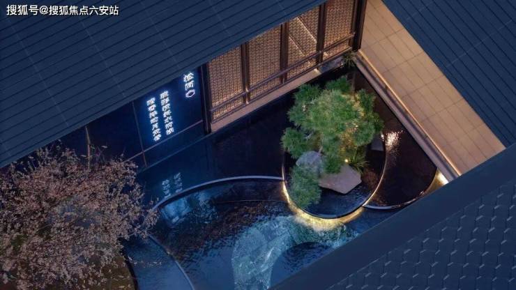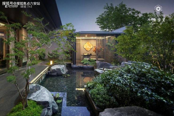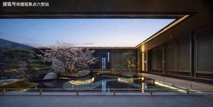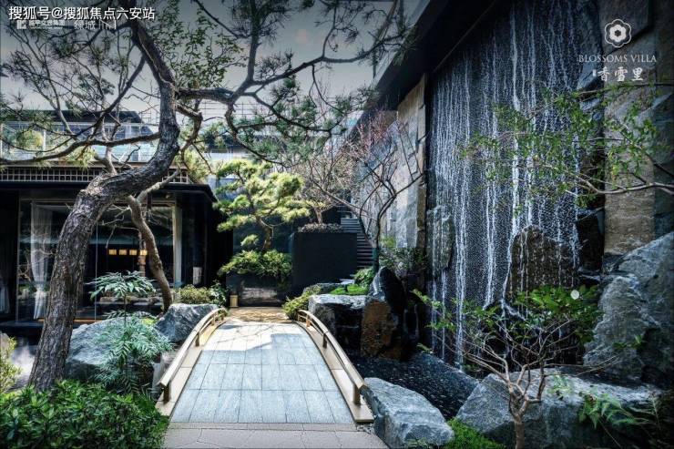 一扇门,门外是喧嚣,门内是静雅。跨过大门,只见梅花树矗立中央,搭配高低错落的黑松树和山石,树下潺潺的水镜,映衬着落梅图案纹理,形成一幅寒梅山涧盛放的山水画卷。