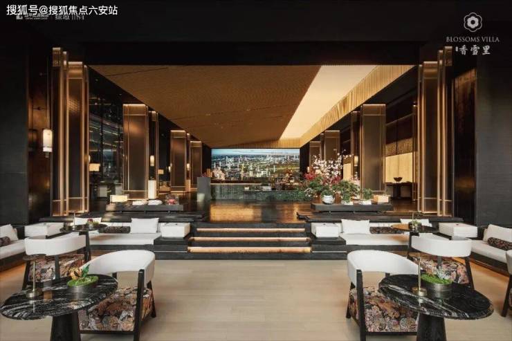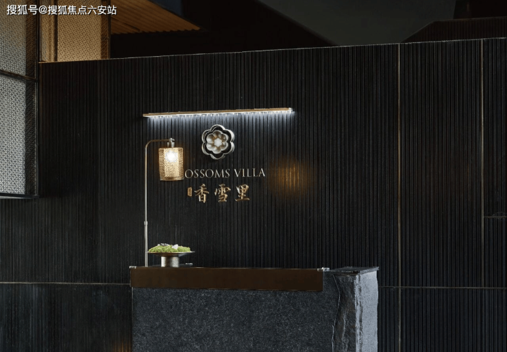 配色和用材都很奢雅,你看大面积景墙是由亚马逊绿奢石打造的,中间金石镶嵌着项目Logo,刻着香雪里的名字,还有超山独有的六瓣梅的图腾,在视觉上就非常惊艳。