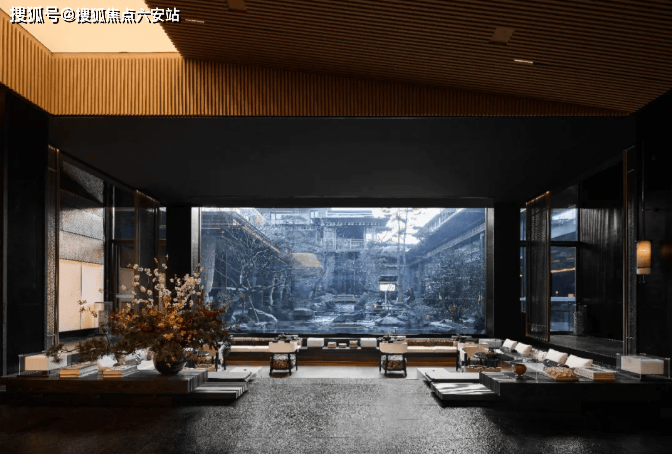 下沉庭院中,光影交织,潺潺流水映照婆娑树影,挺拔树姿注入向上生机,拉近建筑与自然的共鸣。镜面水庭倒映重檐飞角,玻璃幕墙将超山苍翠框成流动青绿画卷,与庭院景观相映成辉。