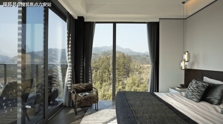 [玻璃山房]南向,以大面积落地玻璃窗,将风景迎入室内,经由充分的通透感拉近人与自然的距离;迈出房间,便为270°“环景大露台”,既拥有高度秘密性设计,还能将生活沉浸在群山环抱中,感受对饮湖山的豪情。
