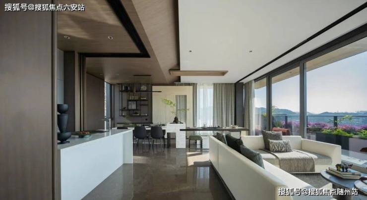 独立前院和礼仪玄关入户,一出电梯门,只见餐客厅和书房一字排开,面宽达约19.8米。一个环绕式超级露台,长度达约30米!由跑道露台、挑高中庭和空中花园连缀而成。