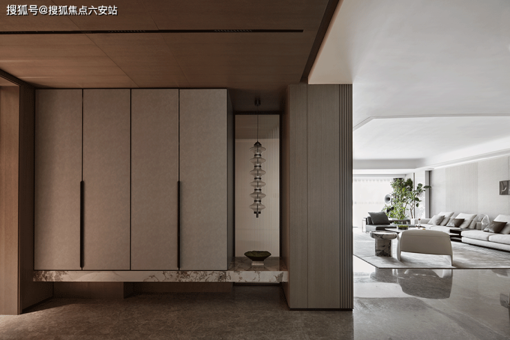 玄关承载着室内外功能转换,也聚焦了家的状态,让一日奔波有了倾注而下的霎那。低饱和度木质基调开启温润柔和的生活序章,皮革柜体旁的造景空间,则为开篇创造出隐性绪言。半透玻璃屏风前垂挂下落的灯饰,让所有疲惫都宛若有了倾述的对象,在模糊的边界内,得以最终隐入那一盆微妙的山海之间。