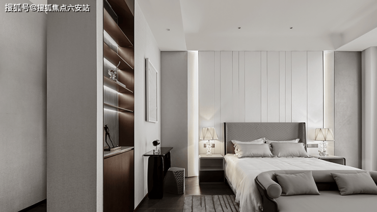 平和疏朗的氛围,是尘世繁碌后的休憩,也安抚纷扰的思绪。主卧的情绪在层层递进后随着不同的触感徐徐展开。与宁静相视,得以感受从身体到心灵的放松状态,在此寻得一场安身和疗愈。深浅皮革包裹出墙面适宜的情感温度,金属嵌条穿越其间,在木质地面的催化下,似乎有着包容万千的气韵。